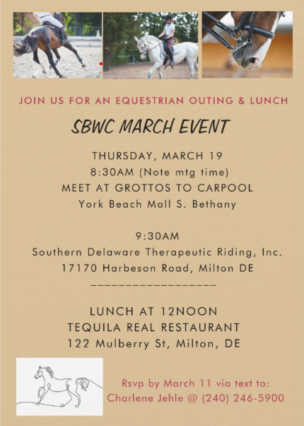 March 19, 2026 - 9:30am Tour of the Southern Delaware Therapeutic Riding Center (followed by lunch at a restaurant). Their program transforms the lives of children and adults with disabilities through equine-assisted therapy, improving both physical and emotional well-being. 12:00n Lunch at Tequila Real Restaurant, Milton, DE.