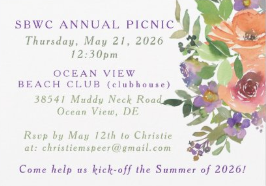 EVENTS ARCHIVED PAST EVENTSMay 21, 2026 -12:30pm - SBWC Annual Picnic at Ocean View Beach Club (Clubhouse) - 38541 Muddy Neck Road, Ocean View, DE - Please RSVP to Christie at christiemspeer@gmail.com by May 12.